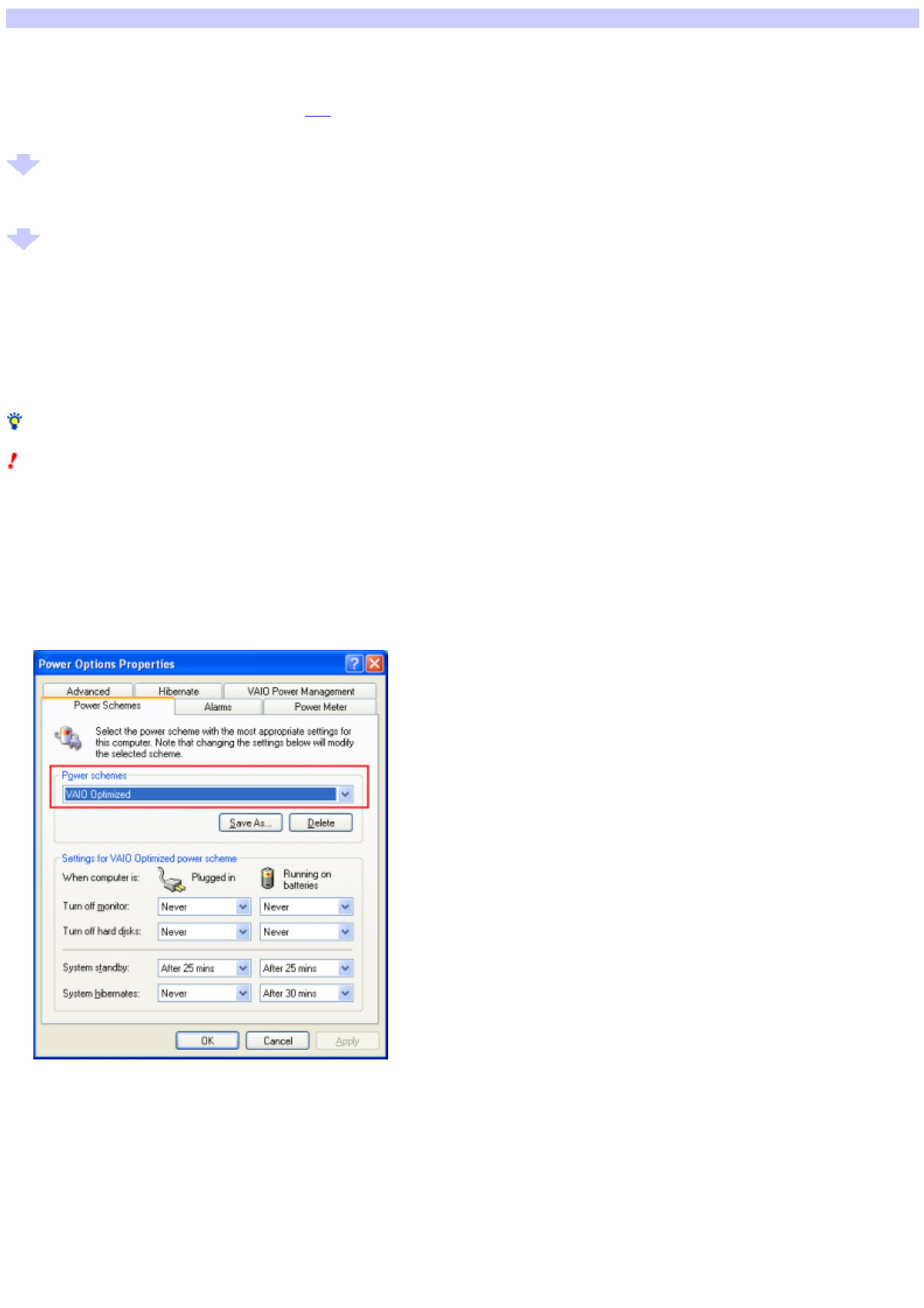 Click VAIO Optim ized in the Pow er schemes drop-dow n list on the Pow er Schem es tab.